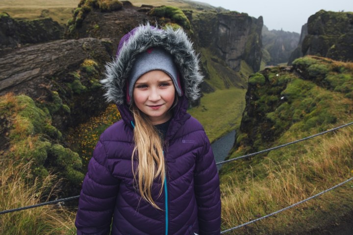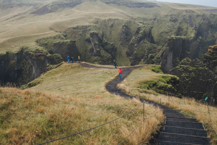 Смотровая площадка находится на выступе одной из скал , практически посередине каньона. А это 2 километра сказочной красоты и практически 100 метров отсюда вниз, ко дну каньона, по которому течёт речушка Фьядра (Fjaðrá) . Название-то какое! Звучит как песня , как имя какой-нибудь девушки-викинга, красивой, независимой и очень-очень смелой)