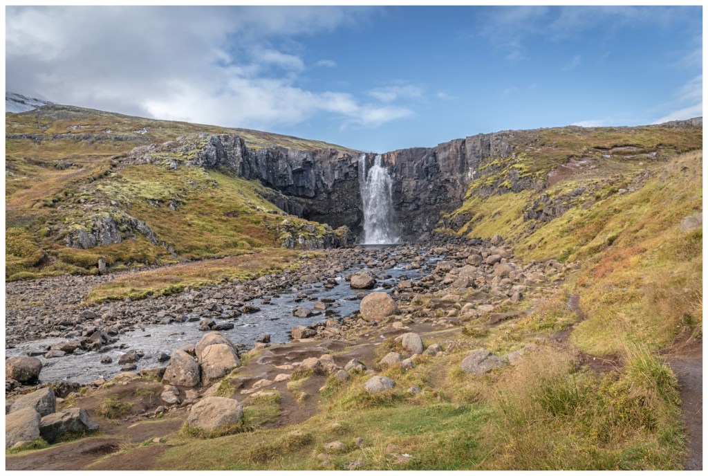 Сразу как выезжаем из Seydisfjördur, натыкаемся на небольшой по исландским меркам водопад под названием Gufufoss. Ну так, водопадишко ,кто-то скажет, по сравнению с другими водопадами на острове. И будет прав)