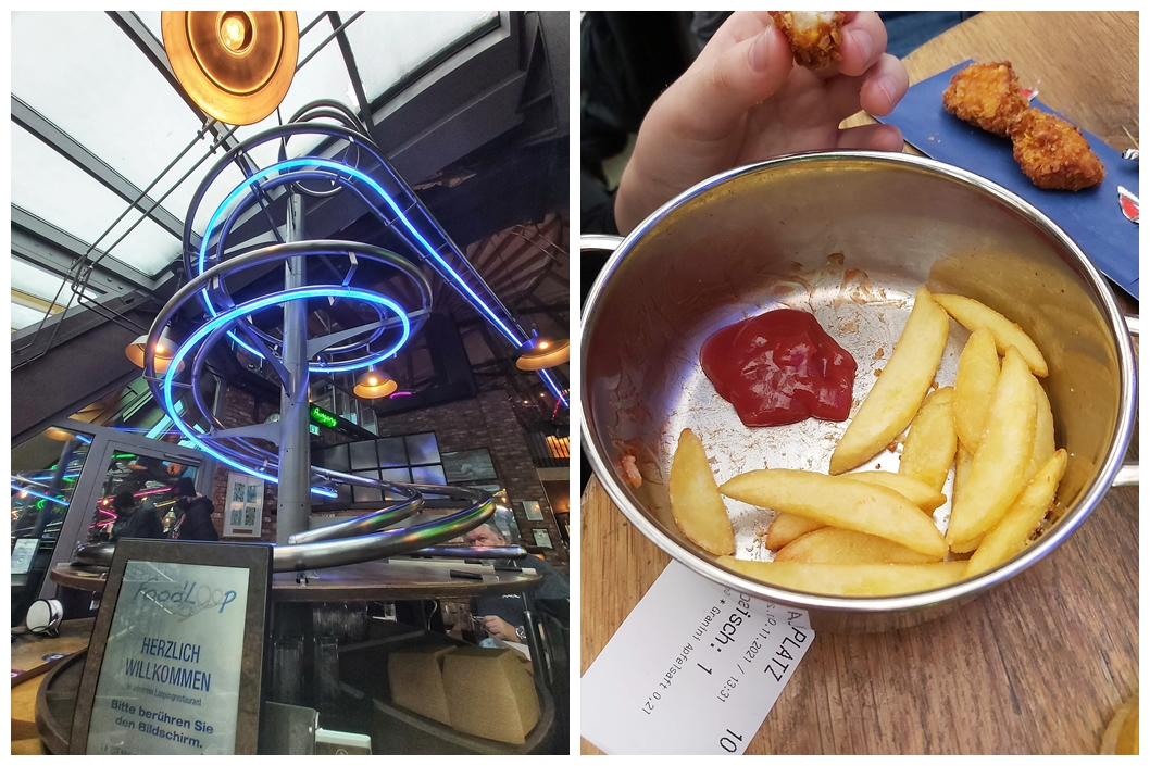 А вот в обед ходили в Food Loop . Ресторан который должен очень понравится именно детям, потому что джанк фуд в кастрюльках прибывает интересным способом — по рельсе с верхнего этажа, где собственно находится кухня, что приводит детей в дикий восторг.