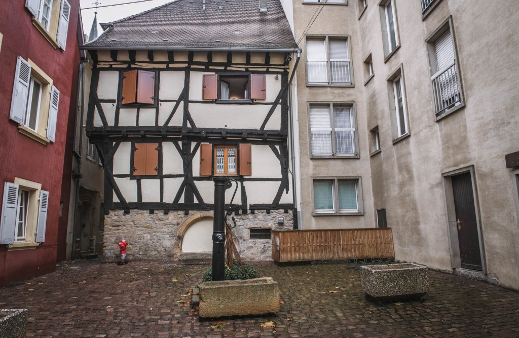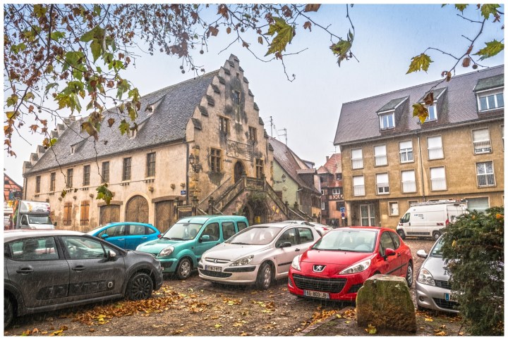 Тут конечно можно словить диссонанс. Старое фахверковое здание с колонкой (ой, как в Селесте) соседствует с современным скучным фасадом с пластиковыми окнами. Обидно, что построили такую некрасивость в историческом центре. Куда смотрели, кто разрешил ….