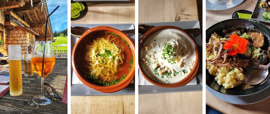 Накануне мы устроили ленивый день и никуда не поехали. Выспались ,потом блинов испекли и только в обед отправились в Мария-Альм пообедать. Почти на самом краю коммуны нашли ресторан Dorfstadl (Oberdorf 44, 5761 Maria Alm). Цены там, конечно, были безжалостные. Простые спагетти без какого-либо соуса — 8 евро, наггетсы для Адельки — тоже 8 евро. Аделька заценила австрийские супы , обычно их подают в небольших плошках , но тут была огромная глубокая тарелка. И она всё съела: и этот суп и спаггети и нагетсы. Наши блюда обошлись в районе 13-17 евро каждое. Про апероль (ещё один, пожалуйста!) в одно лицо я скромно умолчу, но в итоге мы наели и напили на 86 евро. Зато вид оттуда был чудесный, правда, нас осы одолели, так что пришлось перебраться за столик внутри.