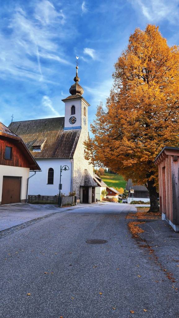 При свете дня оказалось, что улица перед отелем — это что-то совершенно красивое, а это нависающее жёлтой шапкой дерево над дорогой выглядело словно перенесённое сюда с осенней пейзажной картины. Сама деревня оказалась совсем небольшой — здесь живёт всего ничего — около тысячи человек. И вроде бы тут есть всего один небольшой супермаркет SPAR на всю коммуну. Он выше по улице и работает по определённым часам. Муж бегал туда утром, чтобы купить свежий хлеб и выпечку на завтрак. Так что место абсолютно пасторальное и возможно только в зимний сезон более оживлённое, так как это зимний горнолыжный курорт , как я поняла.